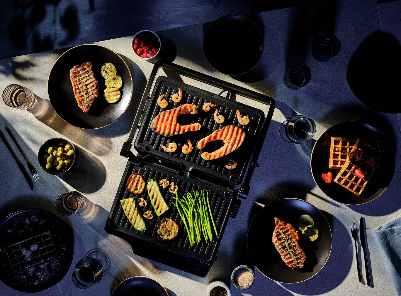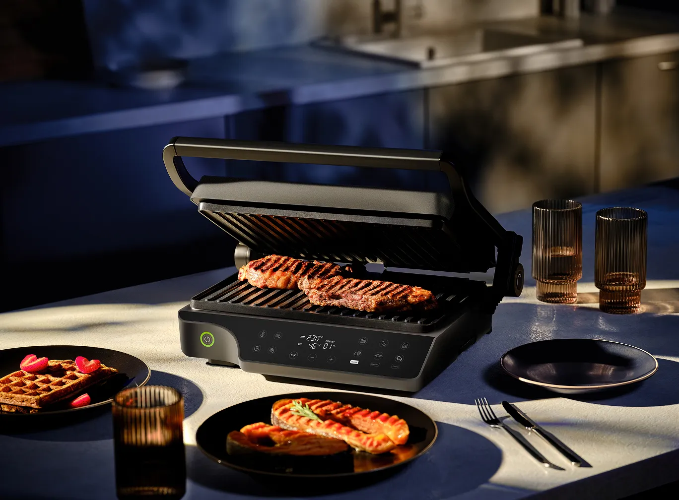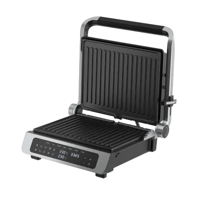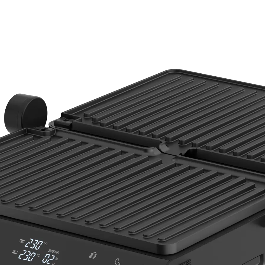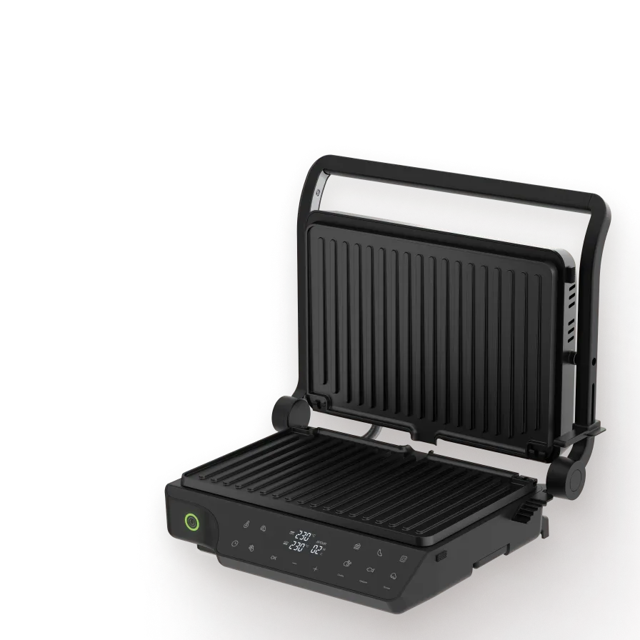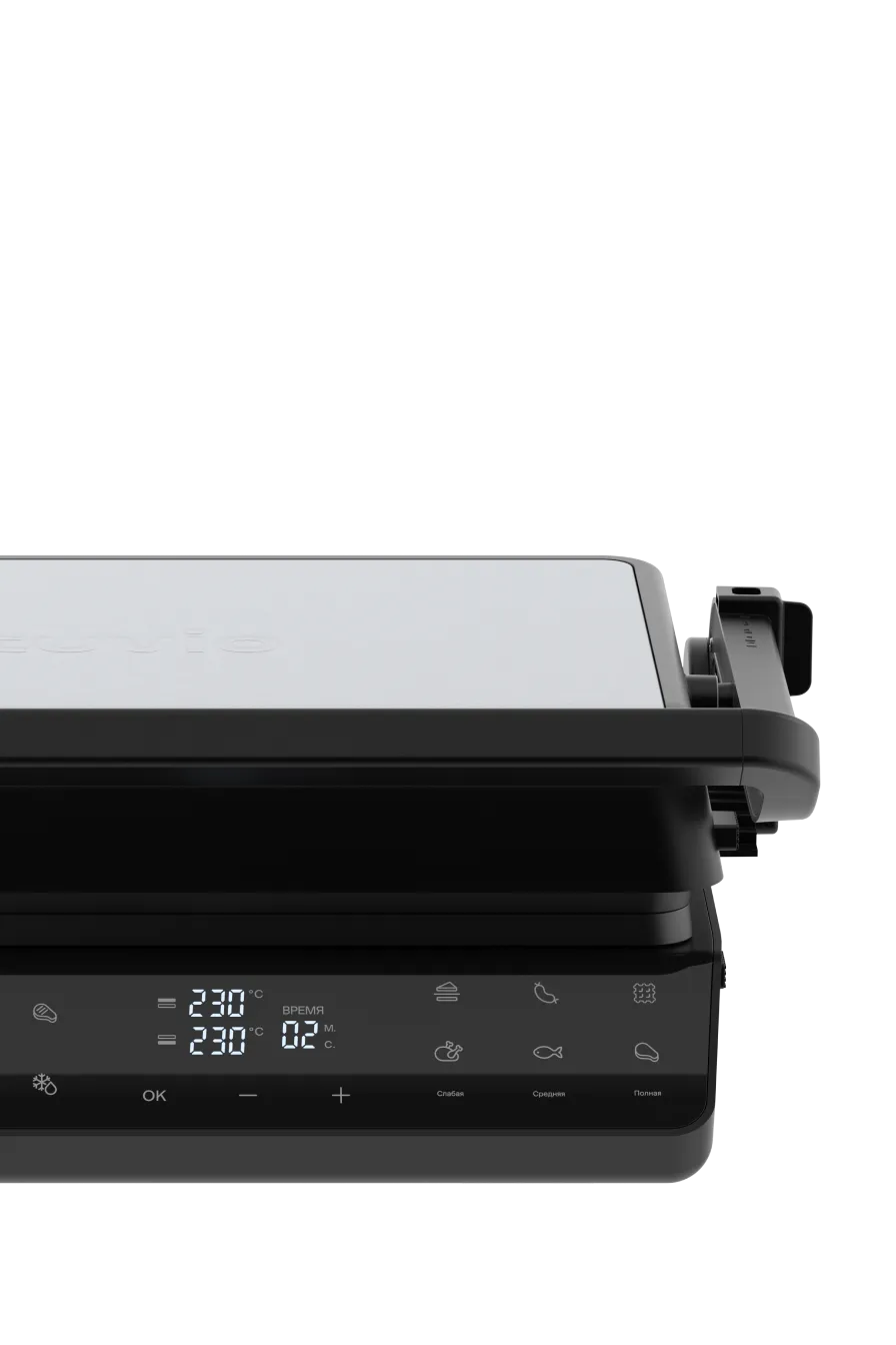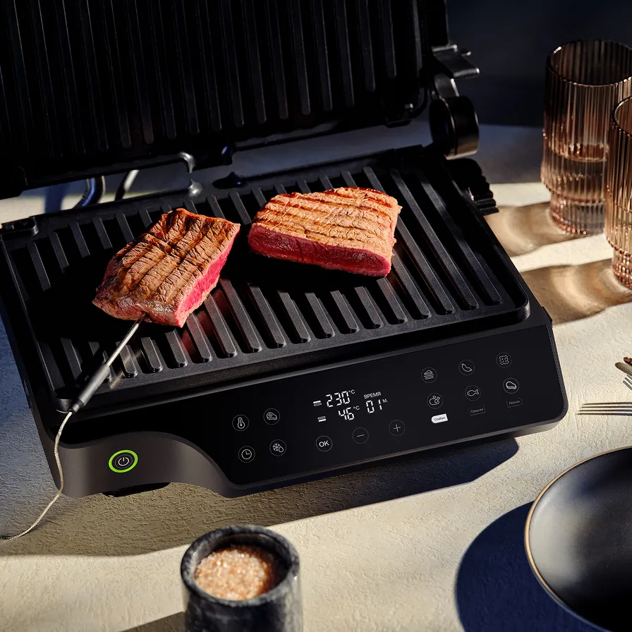 Линейка электрических грилей для приготовления блюд без лишнего масла и как на настоящем огне. Подходит для сытных и сладких рецептов: рыбы и мяса с узнаваемой гриль-корочкой, вафель и сэндвичей