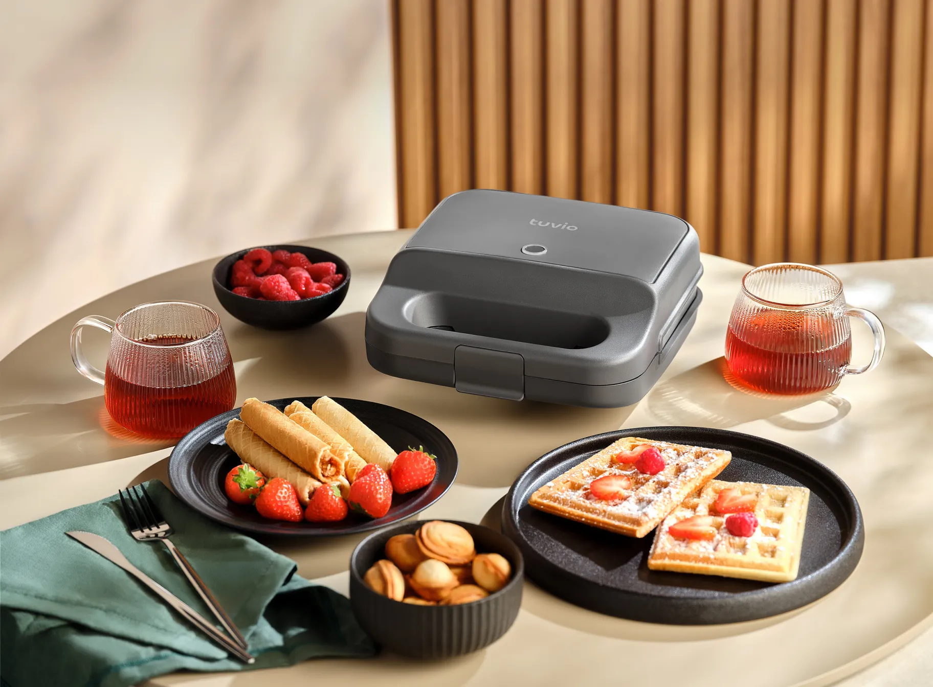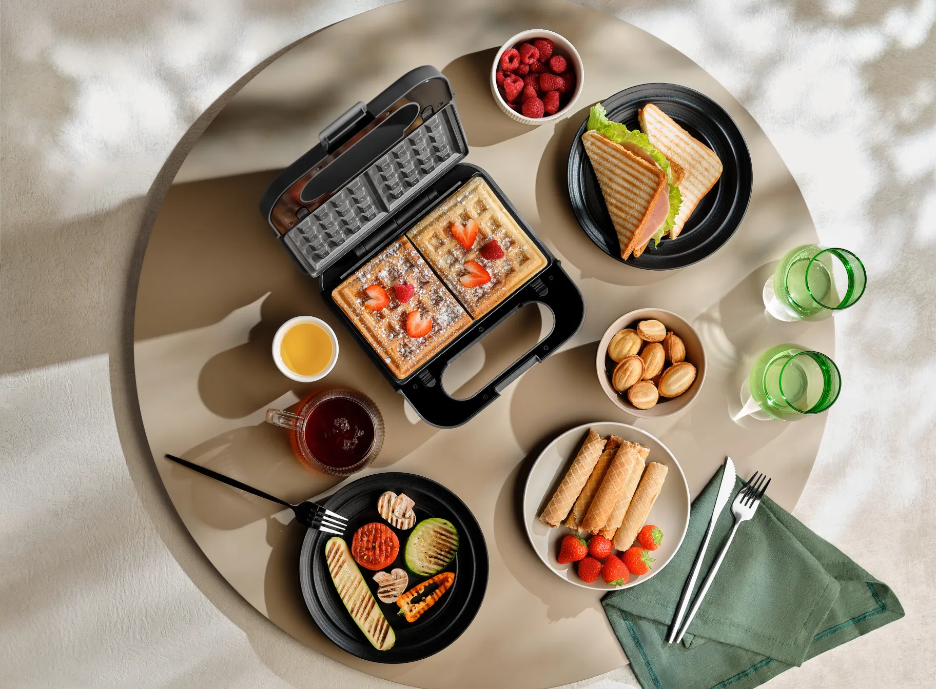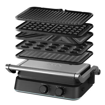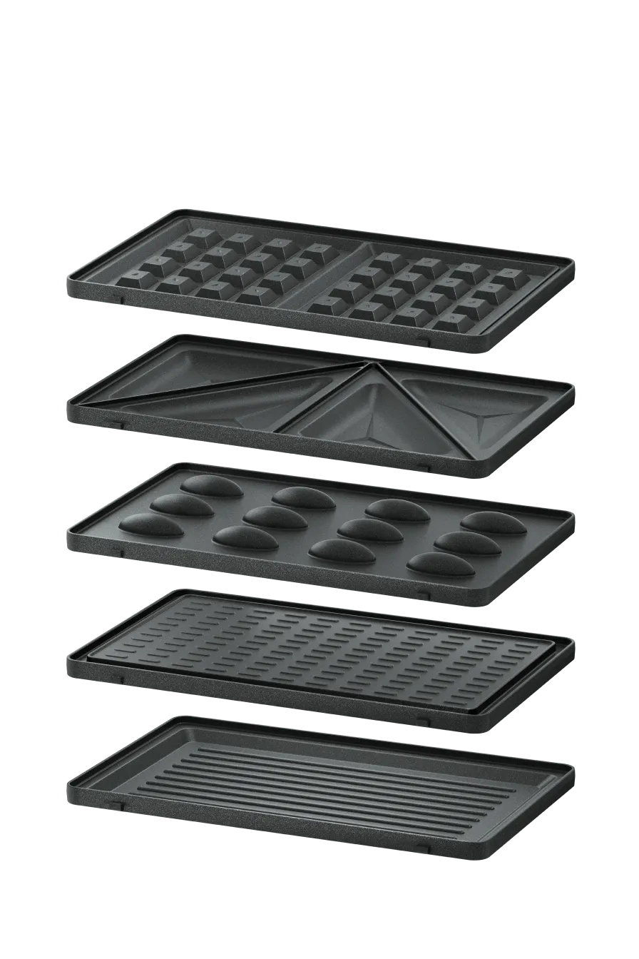Линейка многофункциональных вафельниц со сменными панелями. Созданы для неторопливых завтраков и кулинарных экспериментов: от приготовления разных видов вафель — включая орешки — до ароматного стейка на гриле
